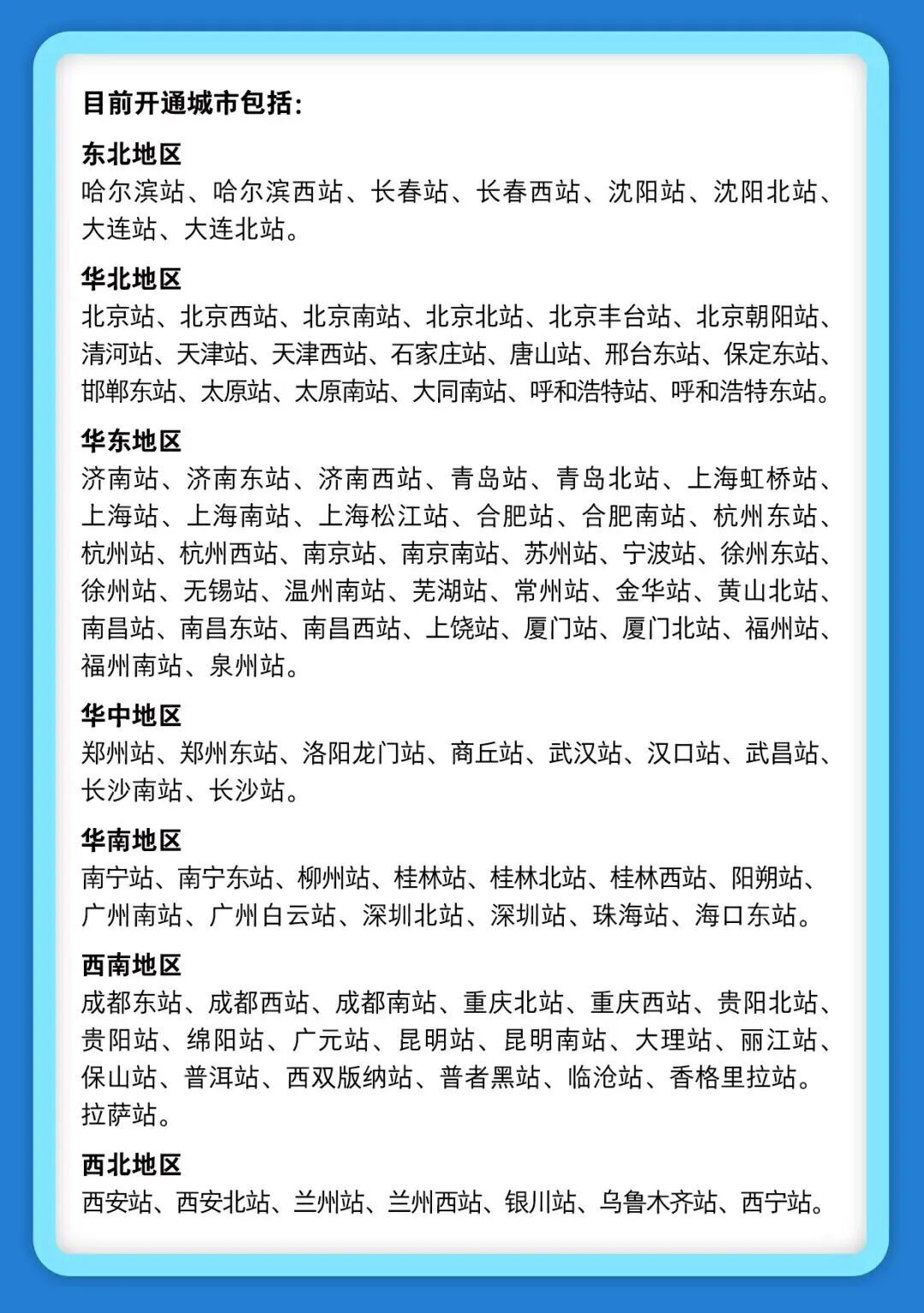 中铁快运自1月15日起扩大“轻装行”服务试点范围,新增哈尔滨、长春、天津、石家庄、西安、南昌、南宁、乌鲁木齐、拉萨等城市的92个车站,总数达到111个,基本覆盖全国省会城市(自治区首府)、直辖市、计划单列市,减轻旅客携带大件行李负担,让乘坐火车出行更轻松。