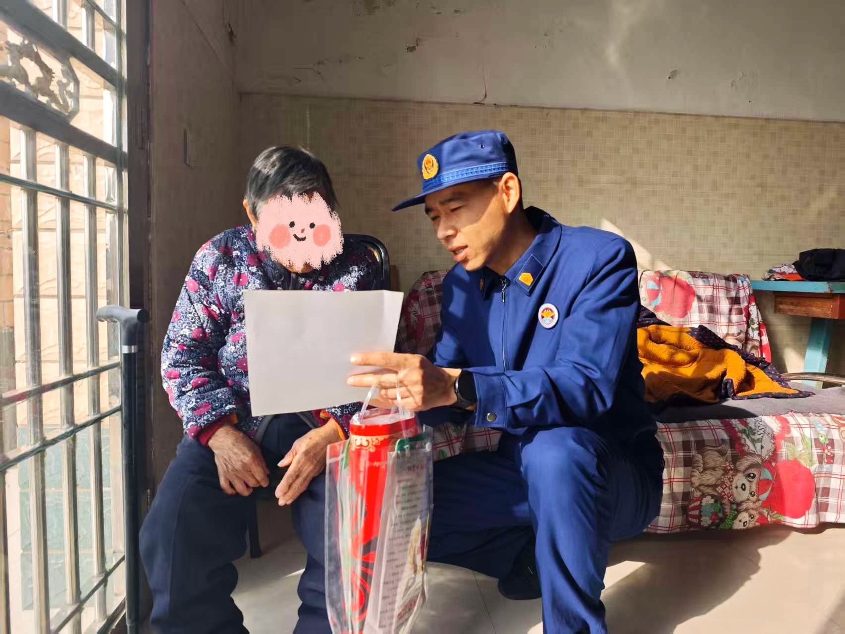 消防员向老人耐心讲解消防安全知识