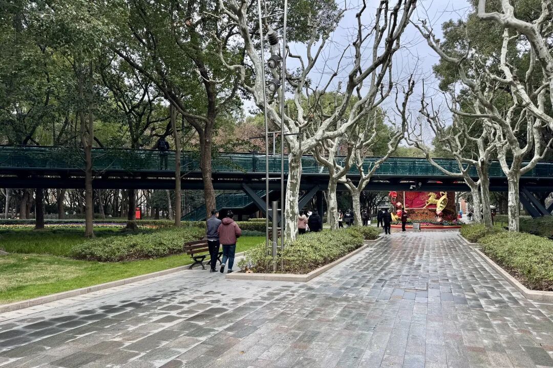 今日天空被云层全程笼罩,体感也更加湿冷。上午10时许,徐家汇公园内客流较平日有所减少,淅淅沥沥的小雨持续洒落,公园内的常青植被经雨水冲刷后色泽鲜亮,叶片上附着的水珠随风轻晃,部分落叶被雨水浸透后紧贴步道。在公园步道上,有少量市民撑着雨伞缓步前行,或是驻足欣赏雨中景致,享受着这份“城市绿肺”难得的清幽。“平时周末人挺多的,今天下雨又很冷,但是绿树红花拍出来的景色也别有韵味。”市民李先生告诉记者。