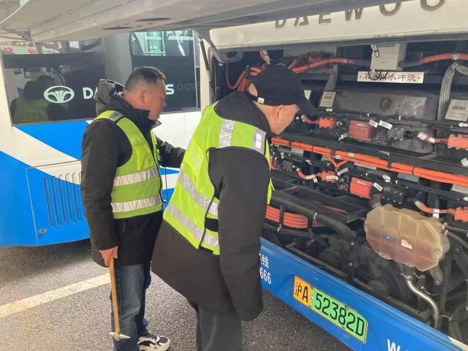 南汇公交修理分公司提前谋划,对全公司运营车辆开展全方位、拉网式专项检修,结合不同车型实施差异化养护策略。针对新能源公交车,重点强化防寒检测与维护,通过技术手段强化电池包保温管理,最大限度减少低温对续航能力的影响;针对常规燃油及柴油车辆,聚焦发动机、制动系统、暖风设备等抗寒关键部件,细致排查管路老化、电瓶亏电等隐患,统一更换低凝点柴油、补充防冻液、调整轮胎气压,同时严格检查车窗密封条、乘客门窗密封性,从源头杜绝车辆“带病”上路,确保每一台车辆都以最佳状态迎战寒潮。
