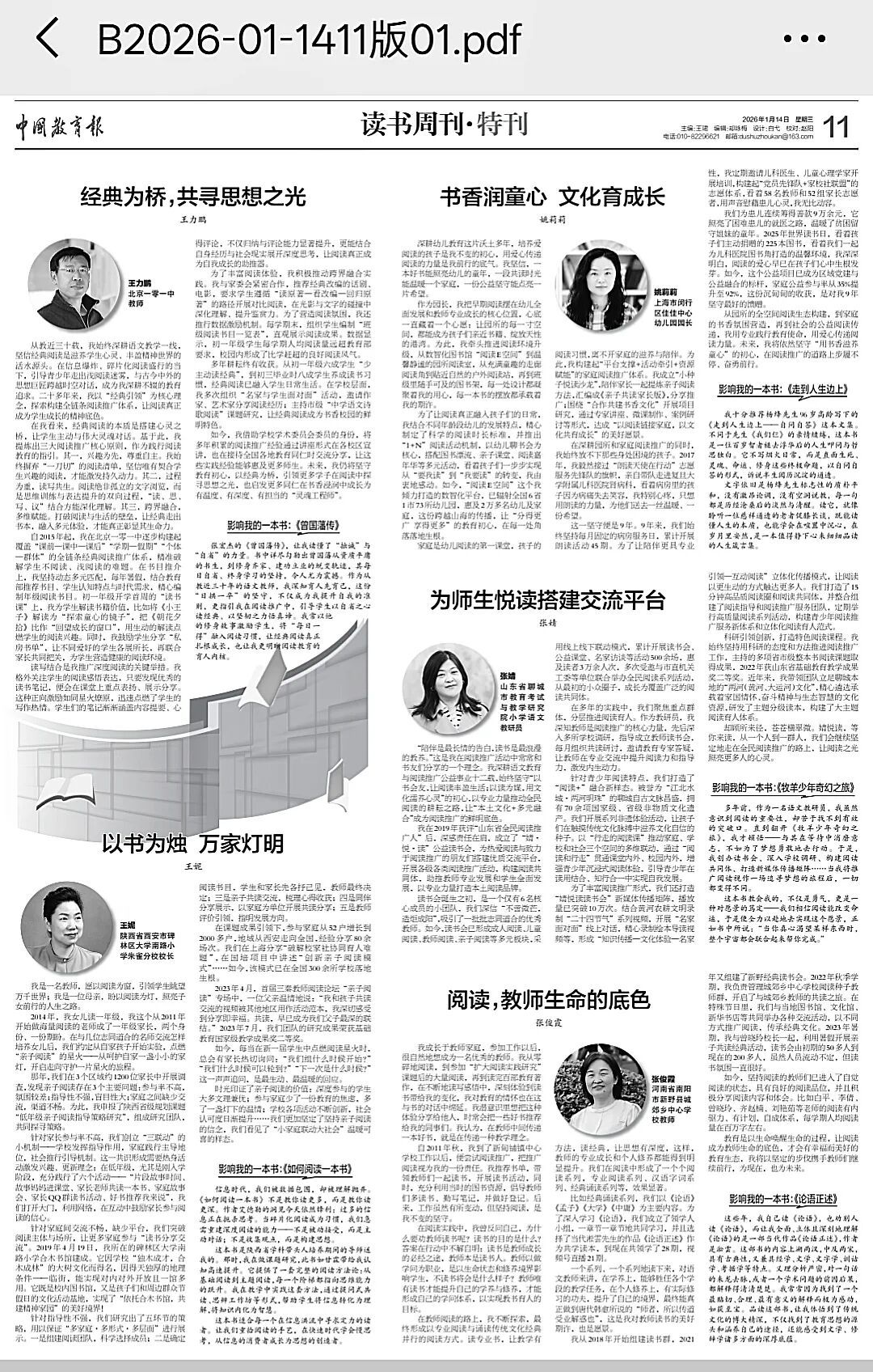 “推动读书十大人物”评选活动自2004年启动,由中国教育报与商务印书馆联合主办,是教育界与出版界共同打造的知名阅读推广品牌。近二十年来,已有200余位校长、教师和教研人员登上这一荣誉榜单。该项目于2009年被中宣部、新闻出版总署评为“全国阅读优秀项目”,持续引领和见证着中国校园阅读生态的发展。