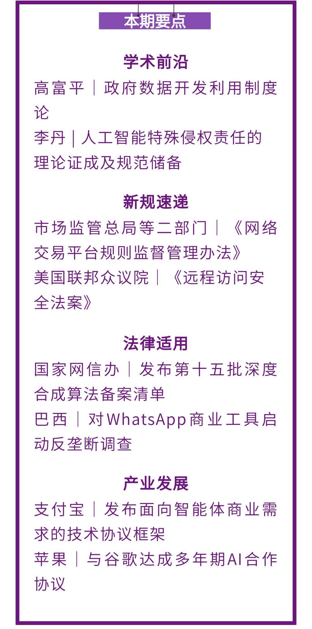 2026年1月12日,美国国会众议院通过了《远程访问安全法案》(Remote Access Security Act)。该法案旨在弥补美国出口管制法律在云端远程服务方面的漏洞。根据该法案,“远程访问”是指外国个人通过网络连接(包括互联网或云计算服务)从物项所在物理地点之外,访问受美国管辖的出口管制物项。此外,美国商务部可根据实际需要在法规中规定其他形式的远程访问也受管制。法案授权美国商务部长在认定某一远程使用场景可能对美国国家安全或外交政策构成严重风险时,可将该远程访问视同对相关物项的出口行为进行管制。(网络法理论与实务前沿)2026年1月7日,国家网信办公布《国家互联网信息办公室关于发布第十五批深度合成服务算法备案信息的公告》。公告依据《互联网信息服务深度合成管理规定》发布第十五批境内深度合成服务算法备案信息,并提示具体算法名称、服务角色(服务提供者/服务技术支持者)、备案主体、应用产品、主要用途及备案编号等内容可通过互联网信息服务算法备案系统查询。本批清单涵盖文本生成、对话生成、图像与视频生成、声音克隆、多模态内容生成等多类型算法,涉及教育、医疗健康、金融、工业制造、电商营销、法律服务、知识产权、交通物流等多个行业应用场景。(网信中国)