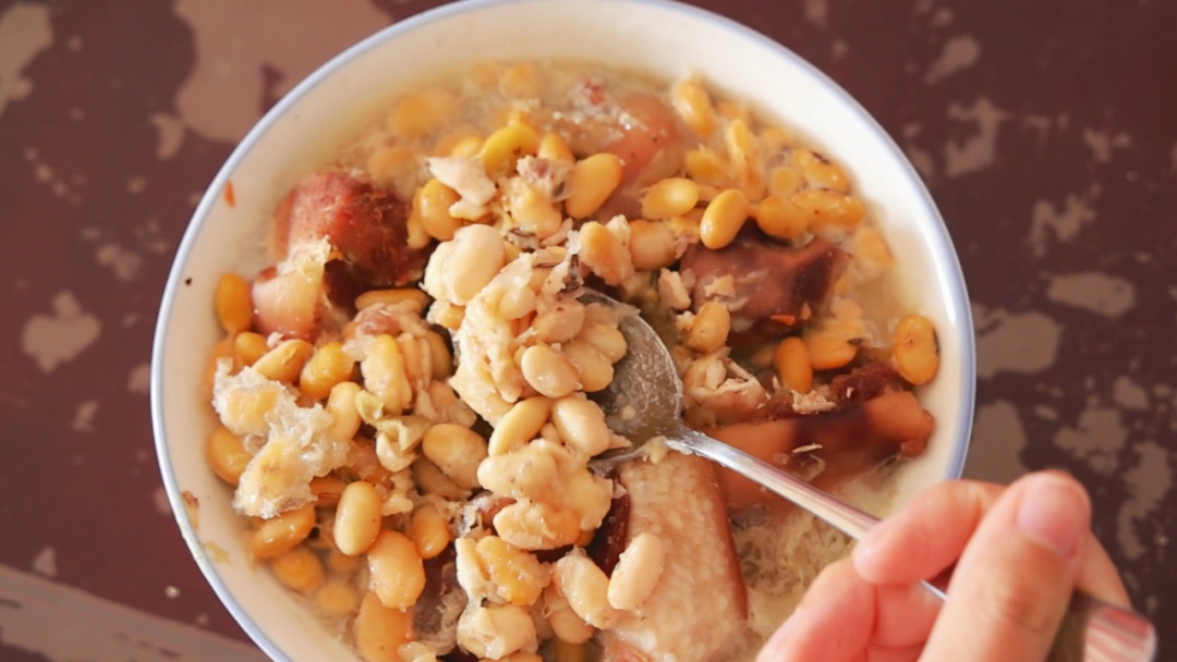 行前村的奶奶提前一晚,在灶间里盛上一盆清水,撒入一把圆润的黄豆,隔夜泡发的黄豆吸足水分,炖出来才软糯入味,还能中和猪蹄的油腻,让口感更丰富。