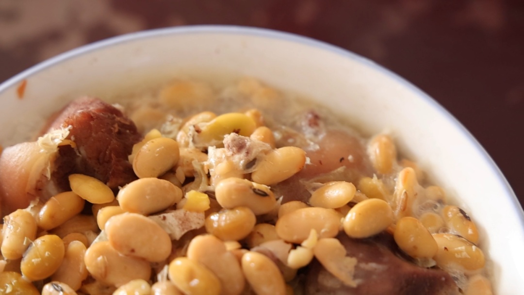洗净的猪脚与饱满浑圆的黄豆先后入锅,细火慢炖。灶膛里,爷爷添着柴火,眼里盯着火苗,控制着火候。随着锅内热气氤氲,黄豆的豆脂与猪脚的胶原在高温下相互交融。原本清亮的水,渐渐变成了醇厚的奶白色。黄豆在汤里翻滚,吸足了肉汁的鲜,却依旧保持着完整的身形。