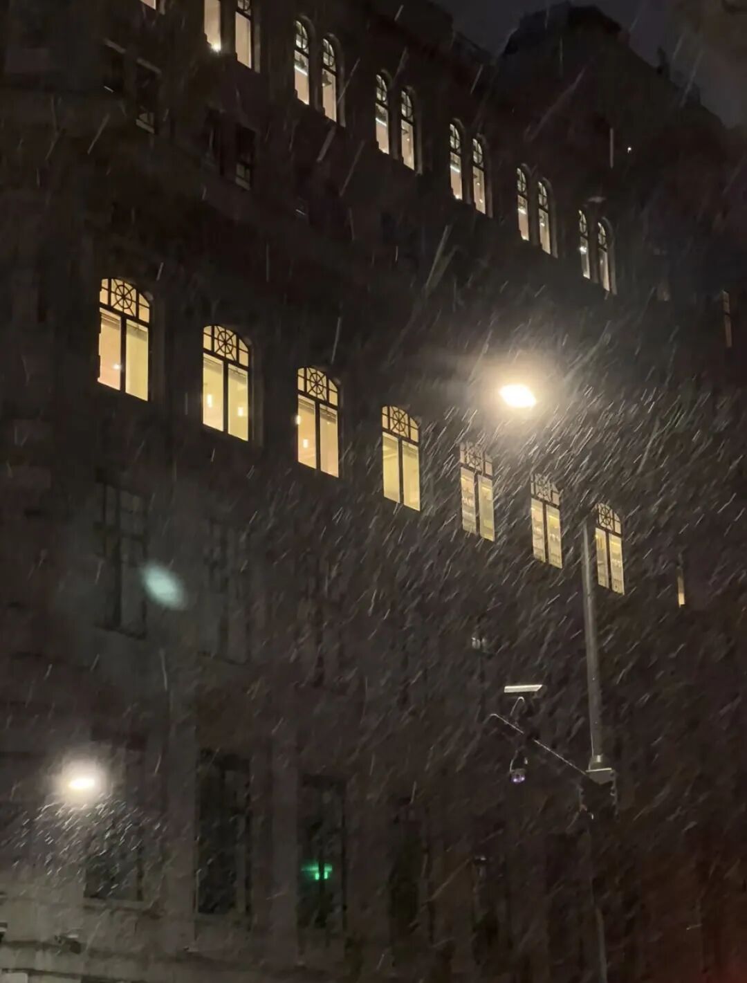 灯光透过花窗映出飞扬的雪花