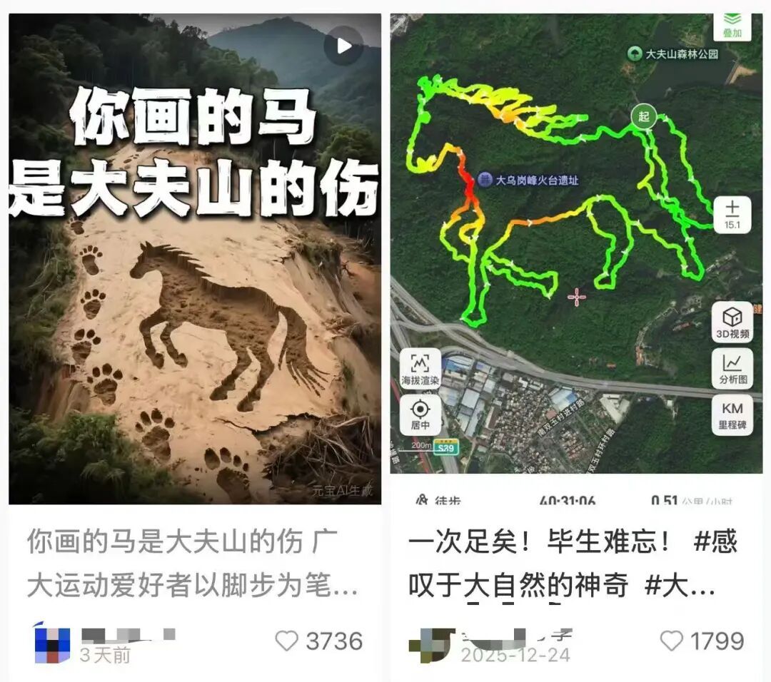 马年将至,在社交平台上,各地徒步爱好者分享了一种创意玩法——“画马”,相关穿越路线攻略一时引发追捧。