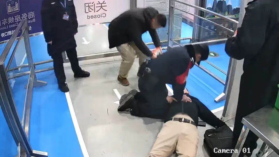 当天早晨6时46分,53岁的旅客赵先生在苏州站北一楼安检口进站乘车时,突然向后仰倒在地上昏迷不醒。正在北一楼执勤的民警张锡华听到安检工作人员呼救,随即到场。此时,已有一名热心旅客在为倒地男子进行心肺复苏。