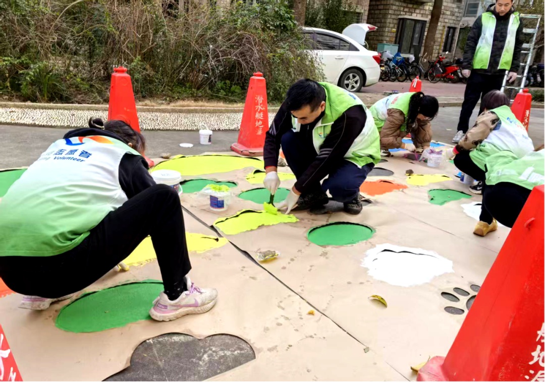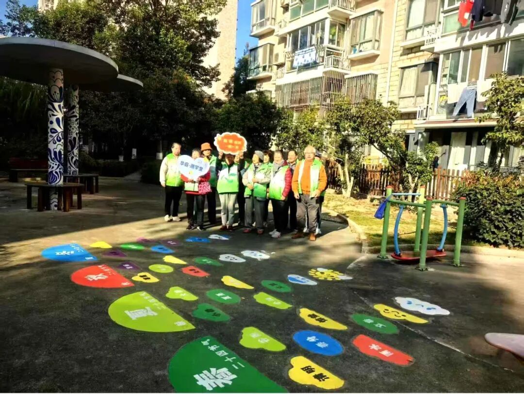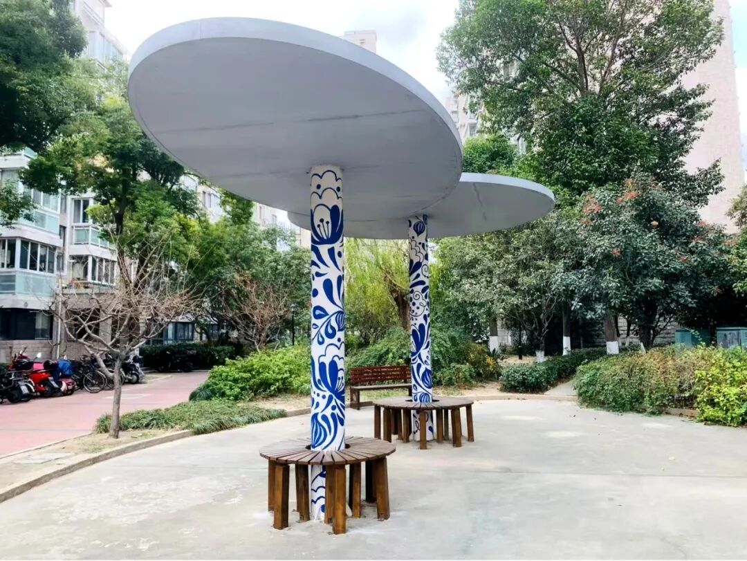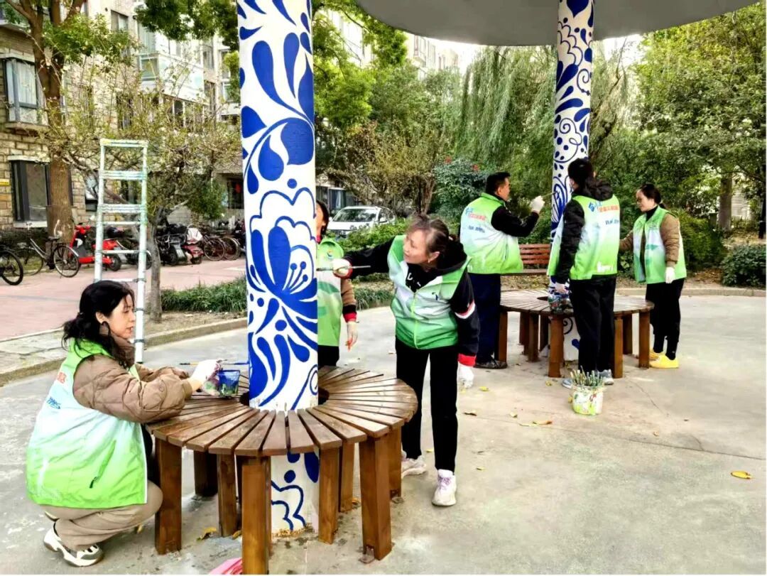 “健身器材旁的椅子老旧了,坐着不踏实。”不少居民这样反映。于是,换新座椅成了大家共同的心愿。不仅如此,通过议事会征集“金点子”,居民们进一步提出:何不让环境更有文化味?于是,立柱上绘起了清雅灵动的青花瓷纹样,在地上画出二十四节气的精美彩绘。这些图案不仅美化了环境,更成了身边可触可感的“活态文化课”——爷爷奶奶带着孩子辨认节气,年轻人驻足欣赏青花纹样,社区里自然生长出许多话题与笑声。