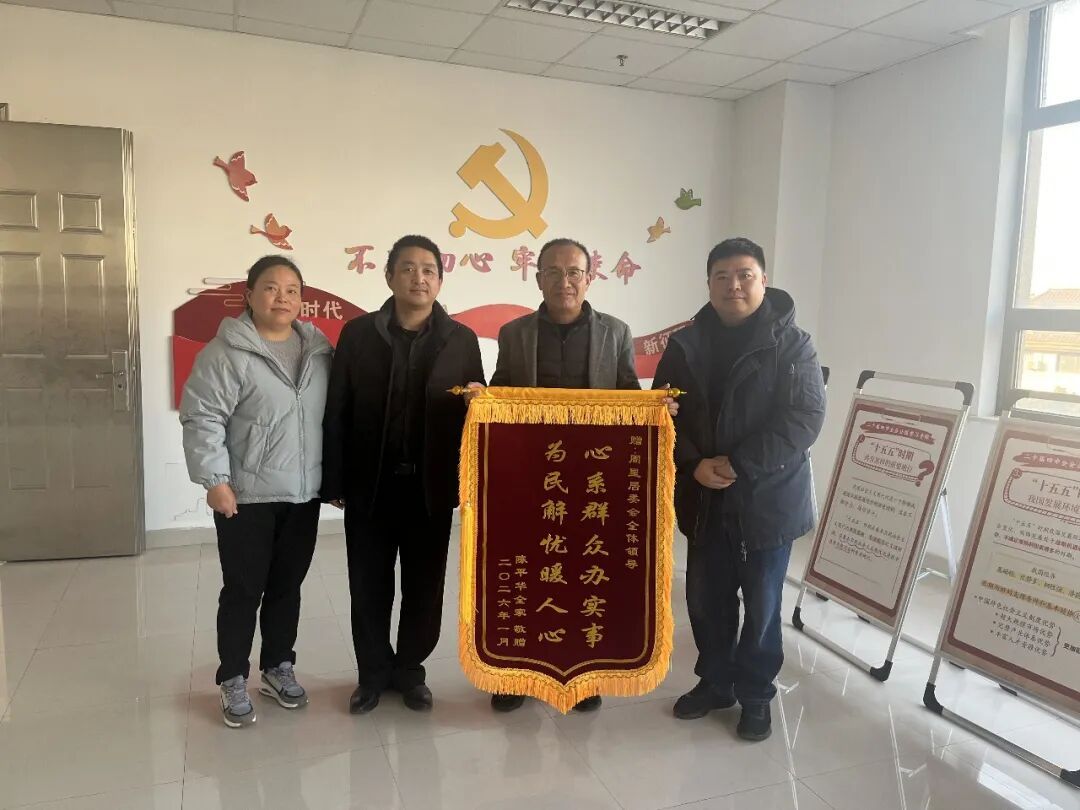 陈平华丈夫(左三)向社区工作人员送上锦旗