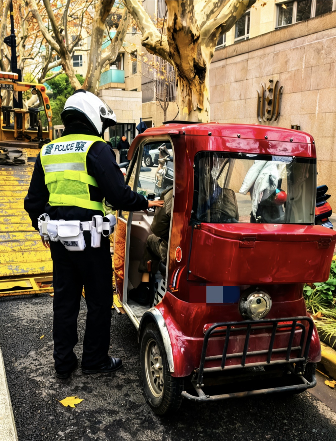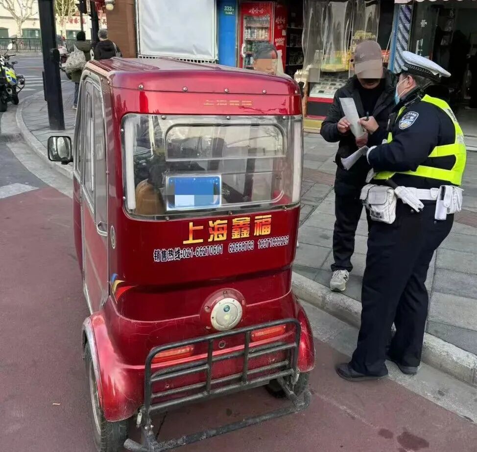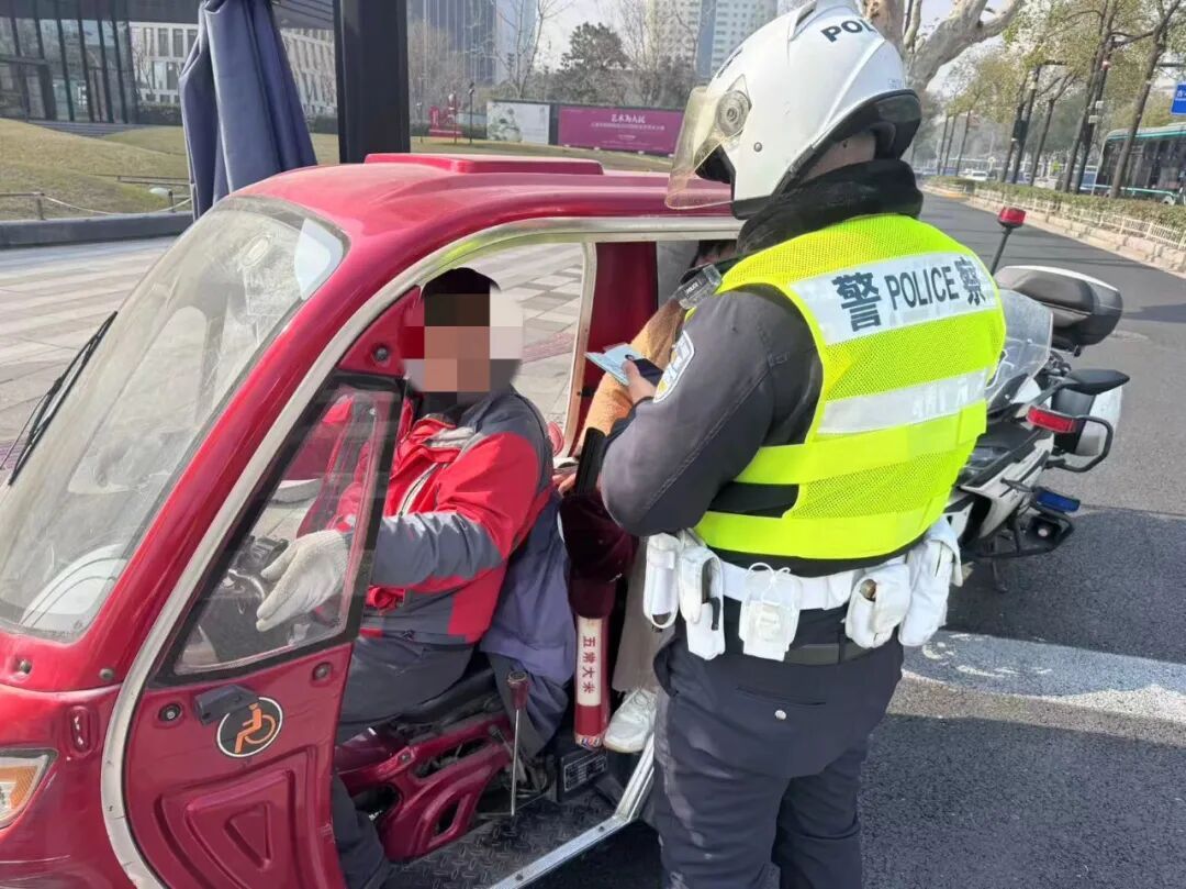 在天山路剑河路路口,民警对残疾人机动(电动)轮椅车加装改装行为进行查处。