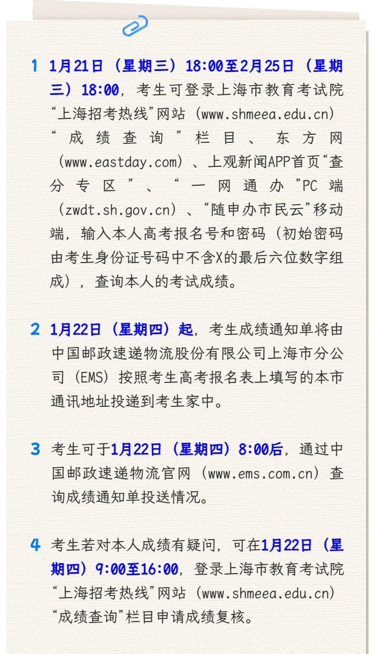 6.1月23日(星期五)12:00起,考生可登录“上海招考热线”网站(www.shmeea.edu.cn)“成绩查询”栏目查询成绩复核结果,成绩复核结果查询截止时间为2月25日(星期三)18:00。