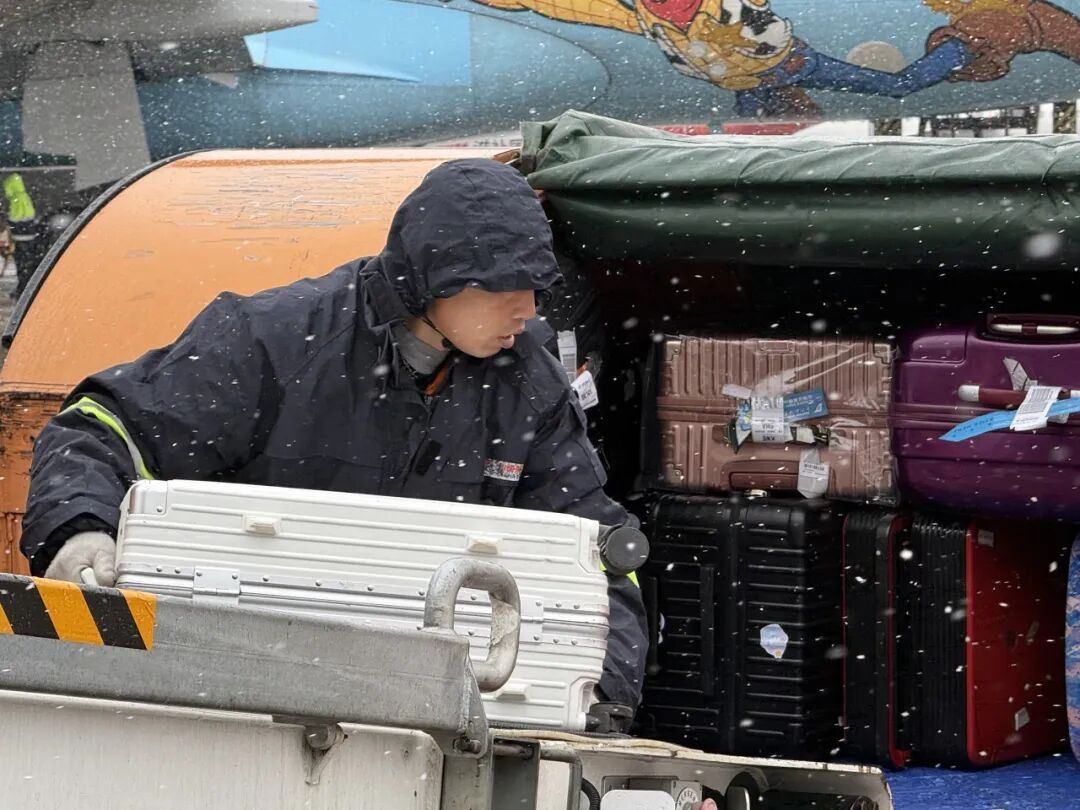 在行李保障方面,东航执行“上盖下垫”操作,为行李遮盖防雨布、垫高隔离栅,防止行李在雨雪天气中受潮。