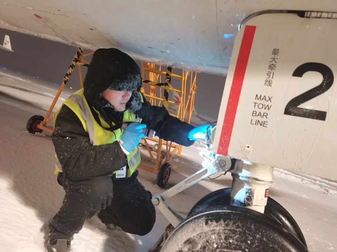 东航技术浦东维修基地在寒潮来临前夕就已提前部署就位了除防冰设施设备、开展了人员冬季运行培训,并特别加强对飞机轮胎、舵面、发动机等关键零部件的检查。
