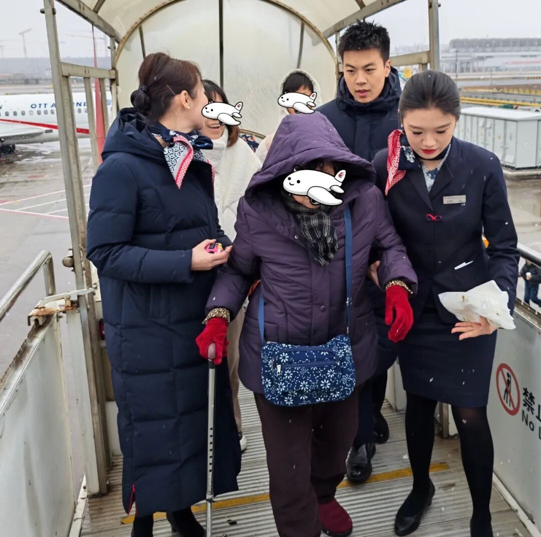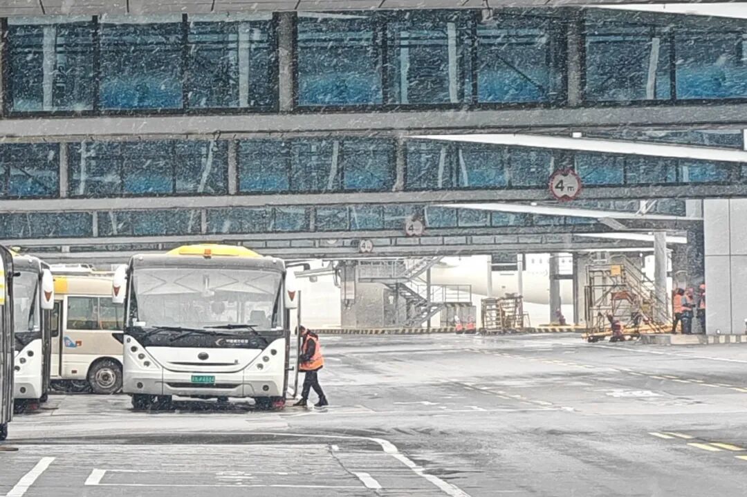在地面服务环节,东航地服人员加强现场组织,在值机、登机等关键区域增派人力,为旅客提供引导与帮助。通过提前启动摆渡车空调制热、及时清理客梯车和通道积雪、对年老幼小及行动不便旅客主动帮扶等措施,保障旅客地面通行安全与舒适。