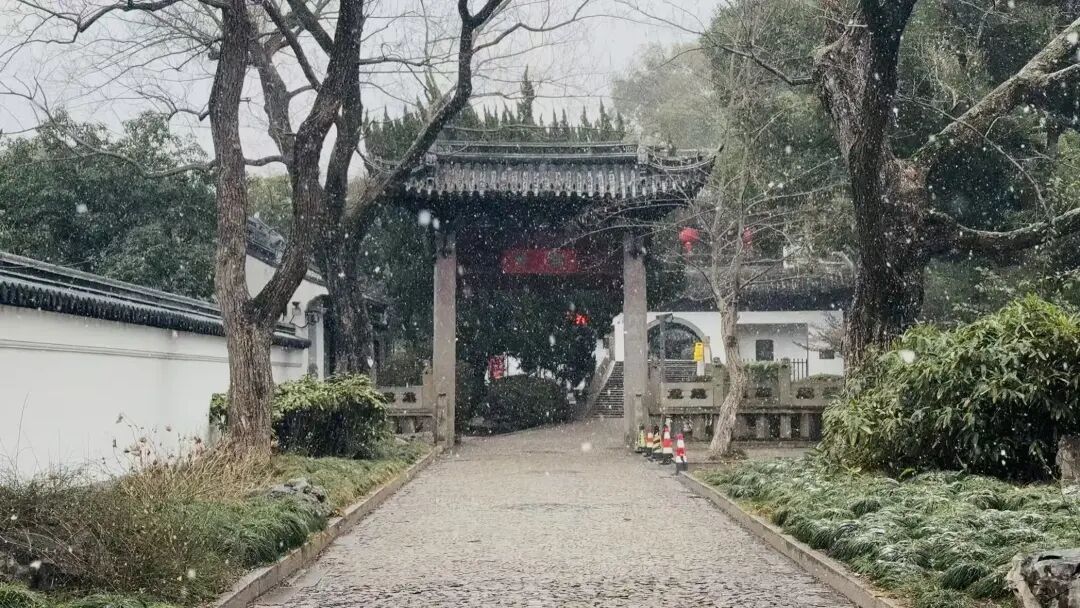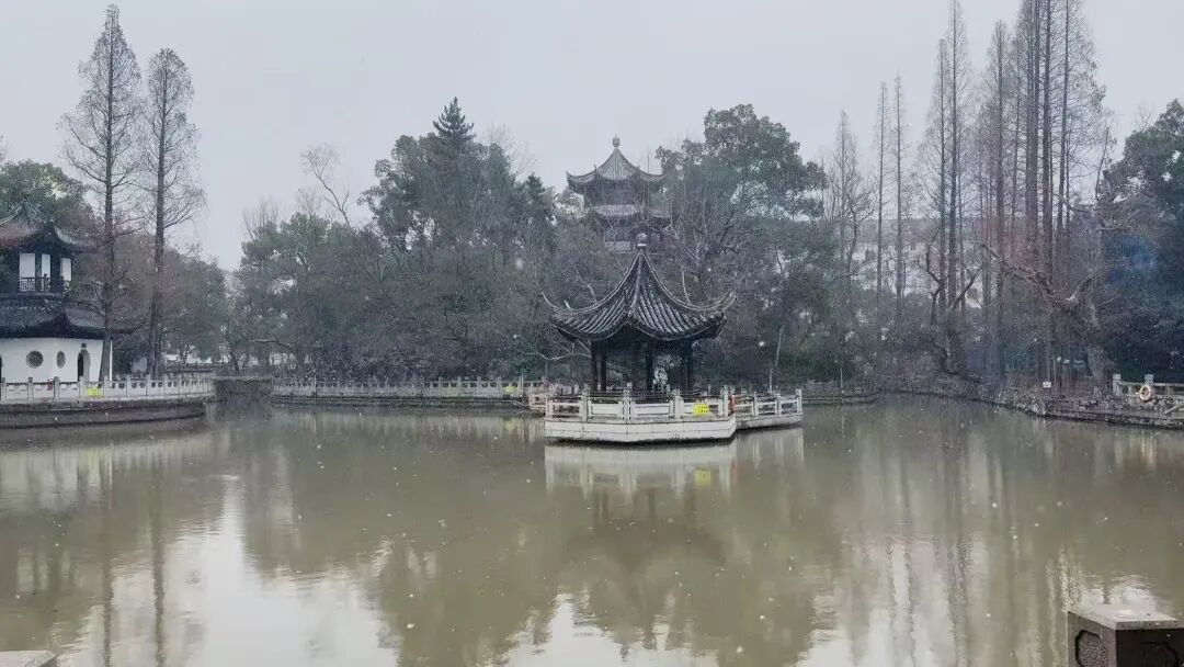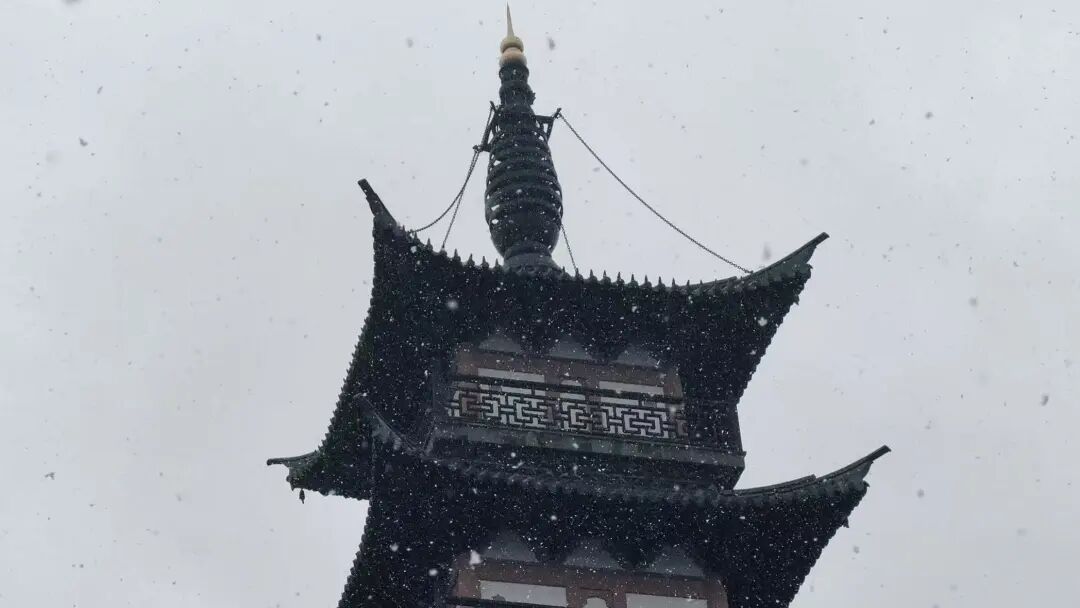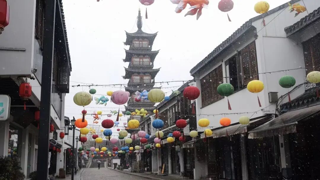 雪花蹁跹,不远处的州桥老街同样如梦如幻。雪落在黛瓦上,覆过青石板,轻拥着蜿蜒的巷弄与安静的河道。始建于南宋的法华塔配上漫天雪花,塔与雪,一深一浅,如同墨痕遇上了留白,绘成一幅江南水墨长卷。