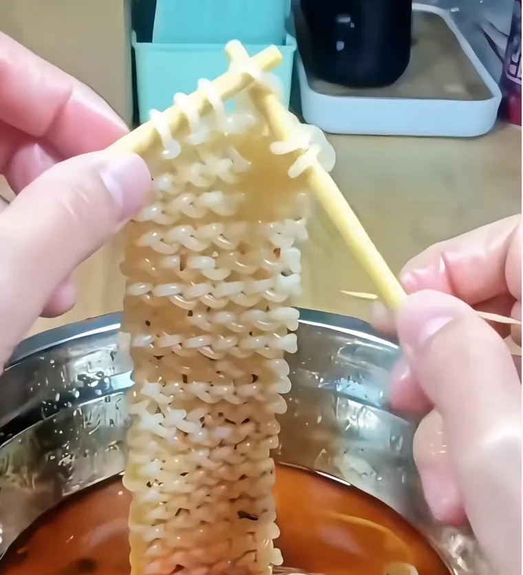 哪怕只是吃碗面,也会变成“织女”们的大型炫技现场:有人仅凭一双筷子,就能把已经泡开的面条,有条不紊地编织回原样。