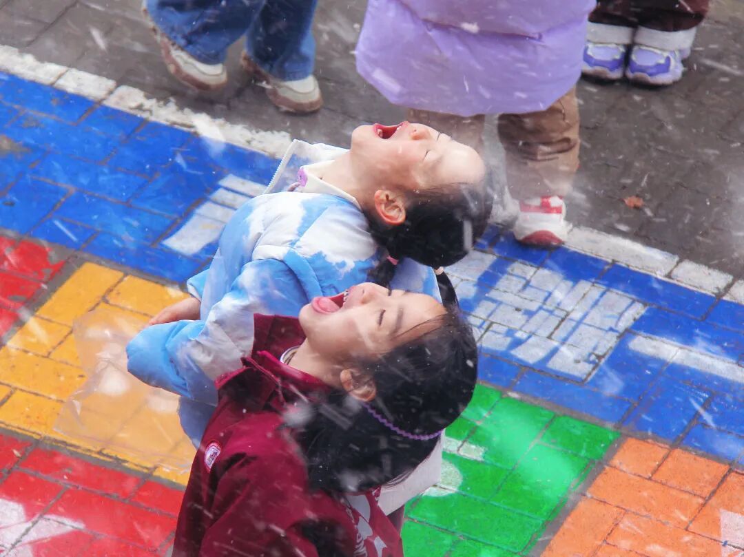 ▲初雪飘落九外实验校园,孩子们欢呼着奔出教室,仰头张嘴接雪,想要品尝雪的味道,满是纯真烂漫(九外实验 崔宝月摄)