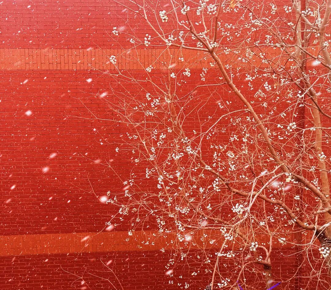 ▲上海初雪,九外实验的校园里红墙映白雪,枝头白果缀琼枝( 九外实验 崔宝月摄)