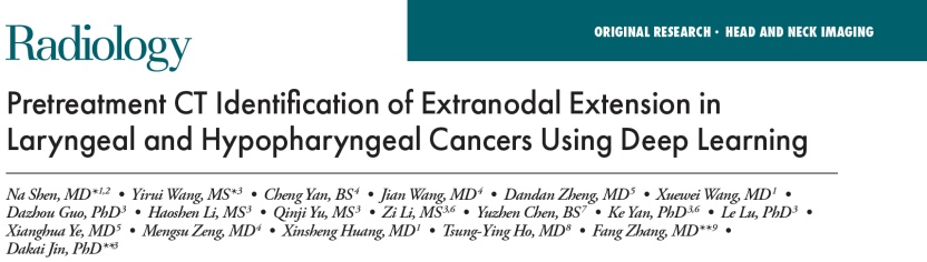 近日,复旦大学附属中山医院黄新生、沈纳团队联合阿里达摩院等多家单位完成一项名为《应用深度学习技术在治疗前CT影像中识别喉癌、下咽癌淋巴结包膜外侵犯》(Pretreatment CT Identification of Extranodal Extension in Laryngeal and Hypopharyngeal Cancers Using Deep Learning)的研究成果,在国际顶级医学影像杂志《Radiology》上发表。