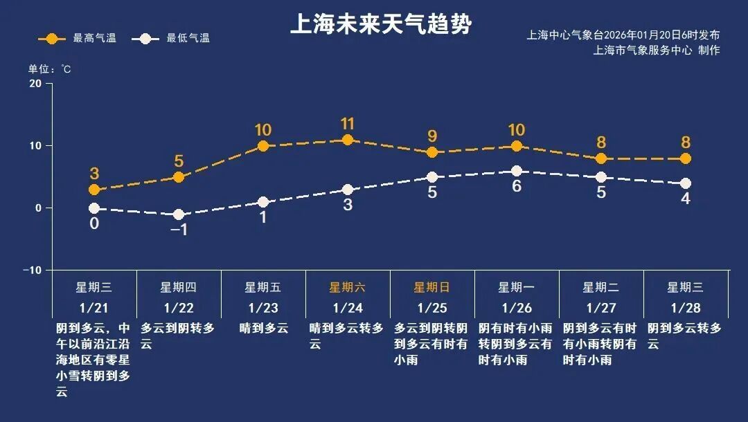 上海中心气象台预计,明日天气以阴到多云为主,沿江沿海地区依旧有零星小雪。目前来看,低温天气将持续到本周四,周四雨雪止步,但早晨气温还要再刷新低,预计市区最低气温在零下1℃左右,有薄冰,郊区零下6℃~零下3℃,有冰冻或严重冰冻,届时出行请注意做好保暖工作。周五起申城重新开启晴好天气,气温将会小幅度攀升。