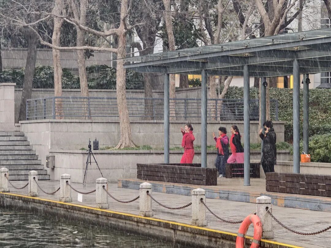 汇金湖畔,密集的雪花纷纷扬扬落下,给平静的湖面“绣”上了细密的花纹。亭下有几位阿姨结伴跳着广场舞,广场上还有市民们做着健身操,寒冷未能阻挡他们享受生活的脚步。市民周阿姨告诉记者:“在上海看到下雪还是比较少见的,能看到雪景心情很好。”