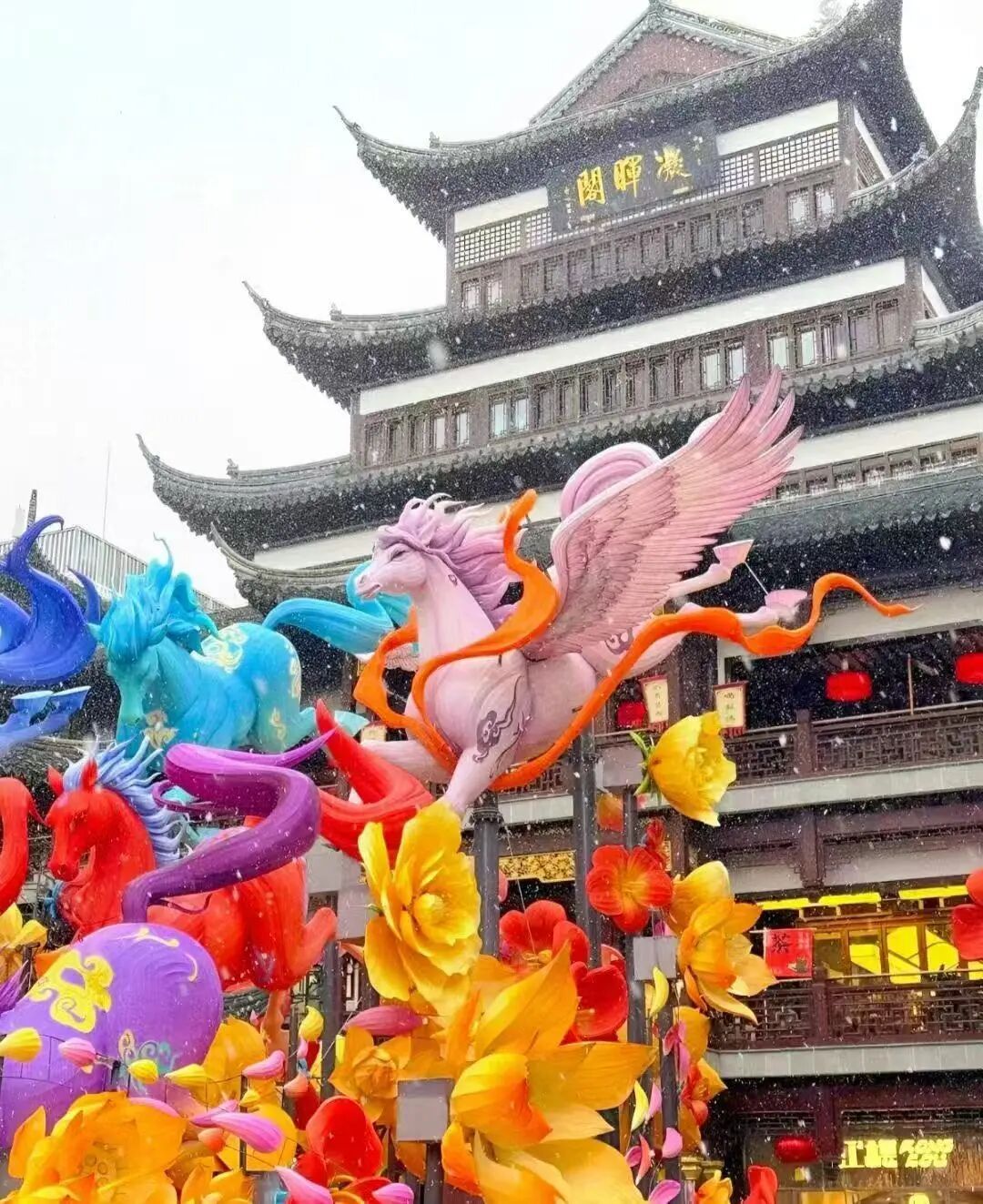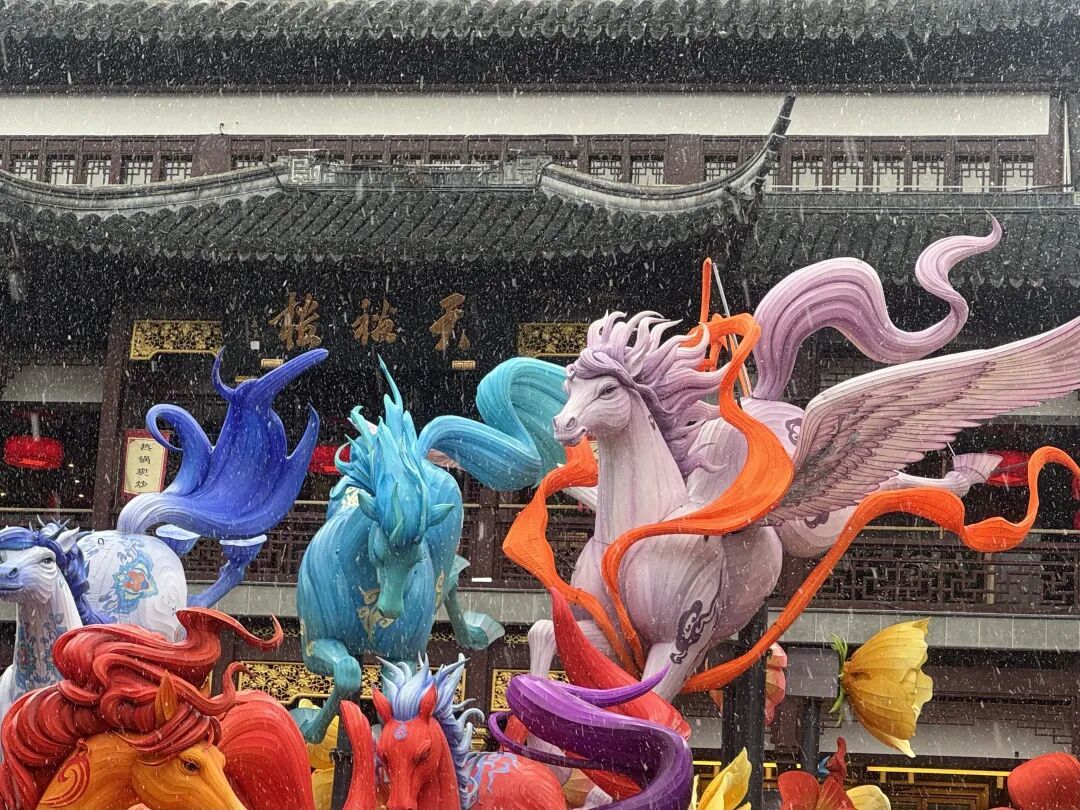 豫园内刚刚搭建完成的马年灯组在雪光的映照下更显璀璨夺目,与这漫天飞舞的雪花交相辉映,共同演绎着一场大自然与人文艺术完美融合的奇妙盛宴,让人们尽情领略着这份来自天地间的奇妙馈赠。