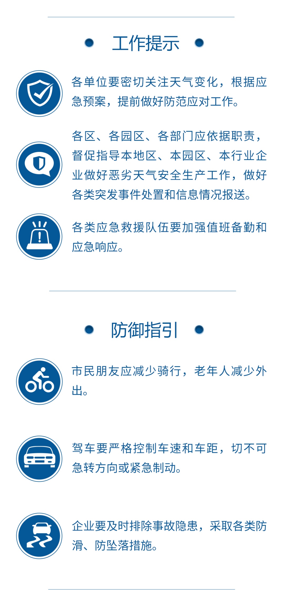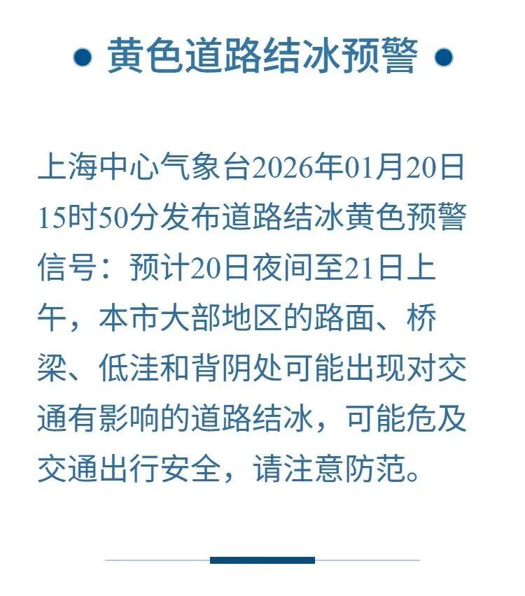 上海中心气象台于1月20日15时50分发布道路结冰黄色预警信号,市事故灾难和自然灾害指挥部决定同步启动全市应对雨雪冰冻灾害三级应急响应行动。请各区、各有关单位按照《上海市应对雨雪冰冻灾害专项应急预案》要求,落实应急值守、防范应对和应急处置各项工作。