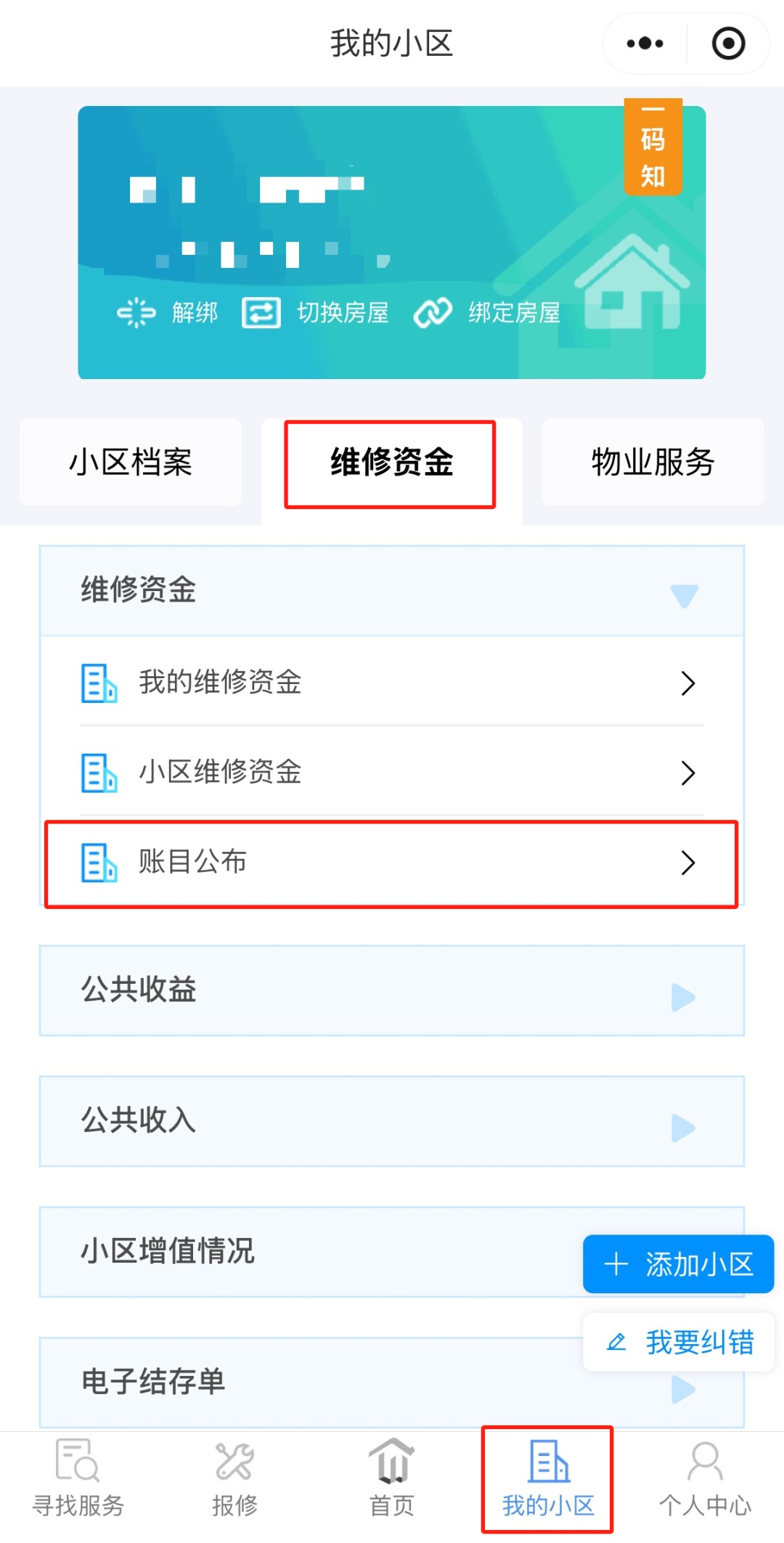 打开“上海物业”微信公众号或支付宝小程序,绑定房屋信息后,可在首页“寻找服务”→“维修资金”→“维修资金查询”/“我的小区”→“维修资金”→“账目公布”中查询小区及所在门牌幢的维修资金账目信息。