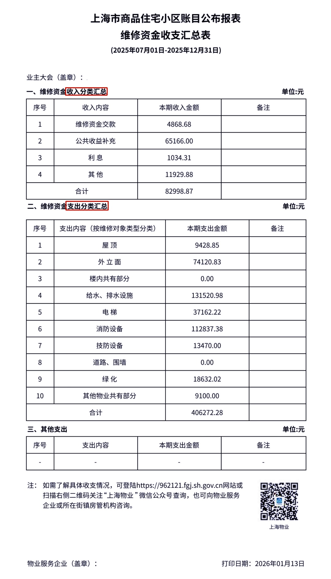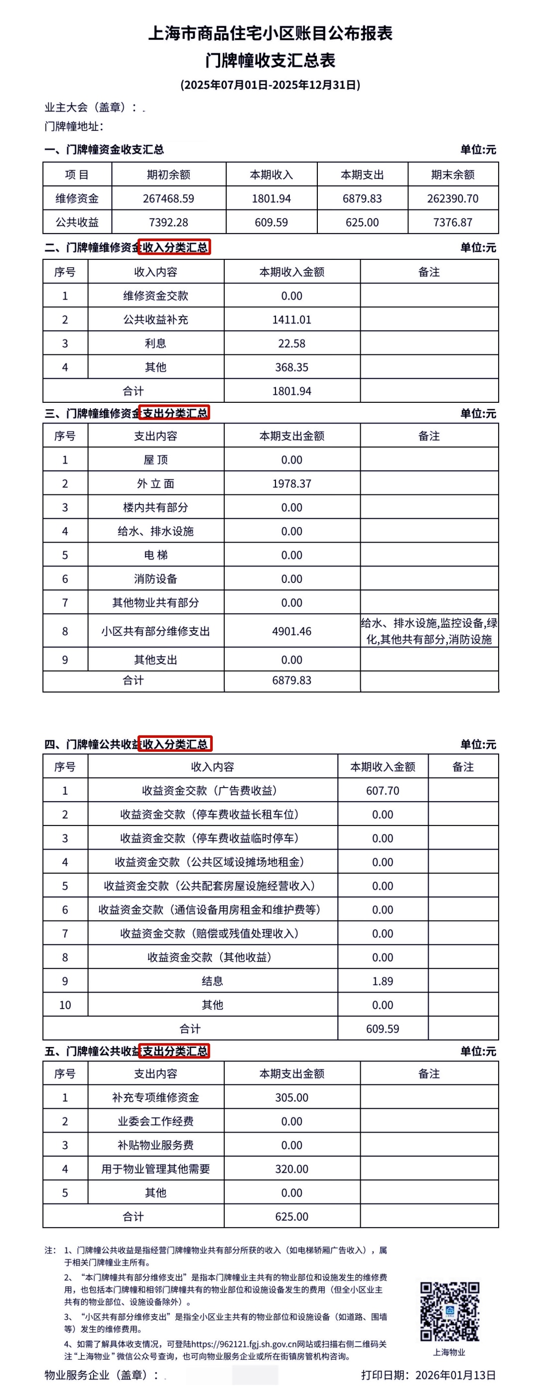 2025年下半年度商品住宅小区维修资金账目将于1月21日公布,届时您可以查询了解所在小区及具体门牌幢的维修资金、公共收益收支情况,以及小区业委会工作经费等相关信息。您可通过“上海物业”微信公众号、支付宝小程序,或登录上海住宅物业网获取详细账目内容。详见↓