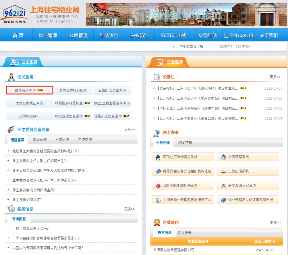 打开上海住宅物业网,点击首页“业主服务”→“维修资金查询”,登录并绑定房屋信息后,可查询相关信息。