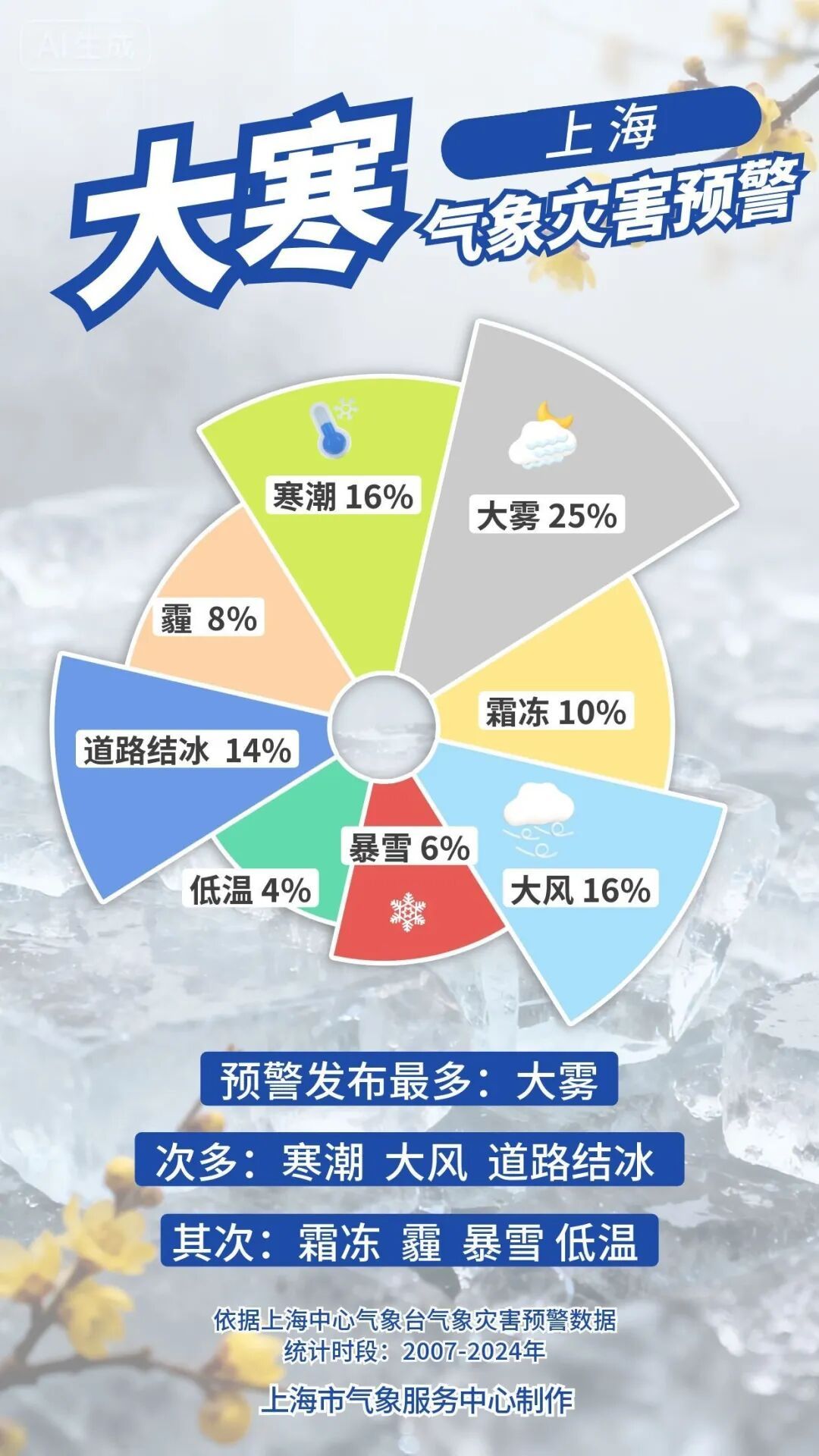 大寒,是全年中的最后一个节气,意为寒冷到了极点。在大寒节气,上海常年平均气温5.1℃,确实是申城最冷的节气。在所有节气中,暴雪、道路结冰预警发布最多,寒潮预警次多。