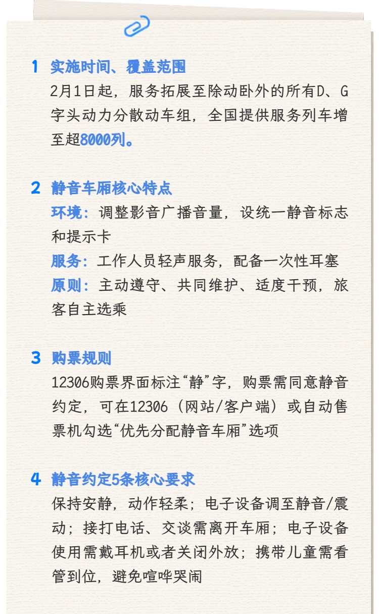 中国国家铁路集团有限公司介绍,为进一步提升旅客出行体验,倡导和共建文明、温馨、安静的旅行环境,铁路部门大力推广“静音车厢”服务,自2月1日起,“静音车厢”服务将拓展至除动卧列车之外的“D”字头、“G”字头动力分散动车组列车,届时全国铁路提供“静音车厢”服务的列车将增至超8000列,更好地满足广大旅客对美好旅行生活的需求。