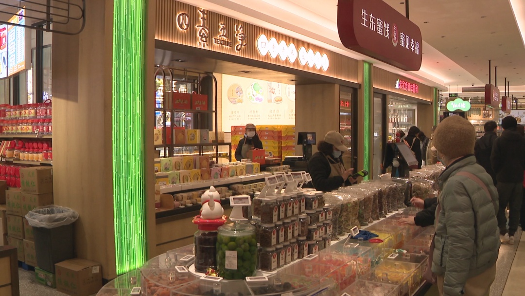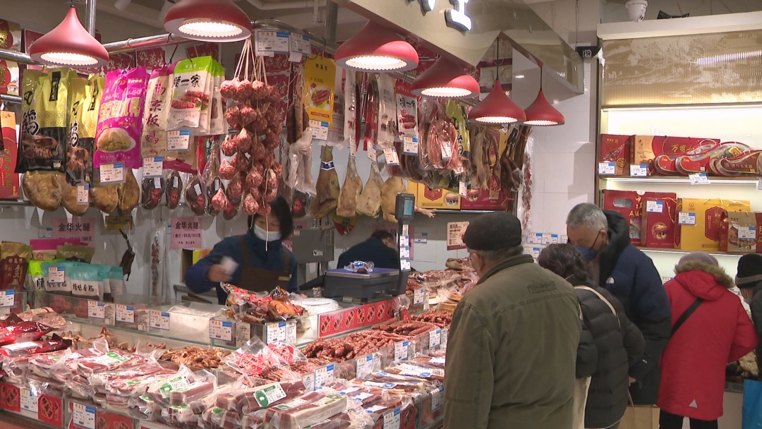 现在又处在数九寒天中的“四九”,“三九”“四九”通常是一年中最冷的时期,民间有“三九四九冰上走”的说法,可以适当温补。尽管最近持续降温,但食品商店的腌腊制品和食品柜台销售火爆,市民游客纷纷挑选各种滋补食品,采办年货,迎接春节的到来。