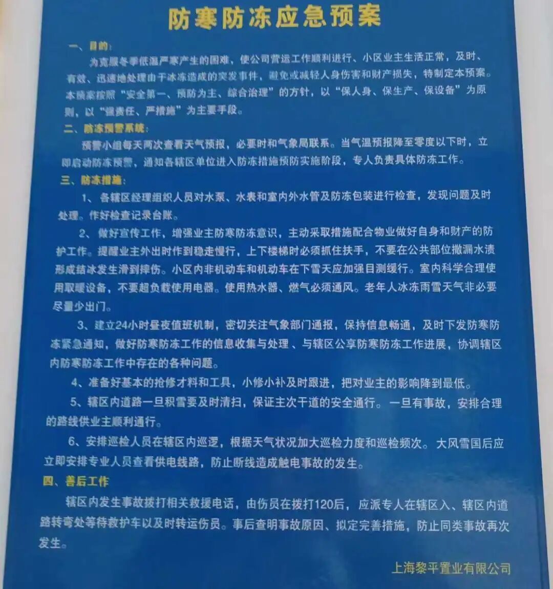 各物业服务企业积极协同居委会、业委会,通过小区公告栏、电子显示屏、业主微信群等渠道,及时发布气象预警信息,提醒居民注意防寒保暖及安全用电、用气。同时,全面排查外露水管、水箱、阀门等共用供排水设施,对包扎破损、保温缺失等问题即查即改;提前备足保温棉、防滑垫、融雪剂等应急物资,确保抢险力量随时响应、高效处置。