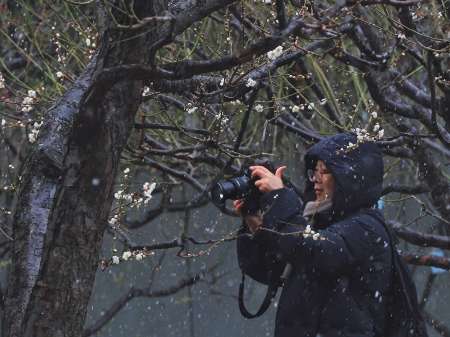 园内有几位市民冒雪前来,记录这“梅雪同屏”的瞬间。专程前来的摄影爱好者龚先生告诉记者:“我是在网上看到这里龙游梅开得很好,就想今天抽空过来看看。没想到下了雪,真是难得的好机会!”
