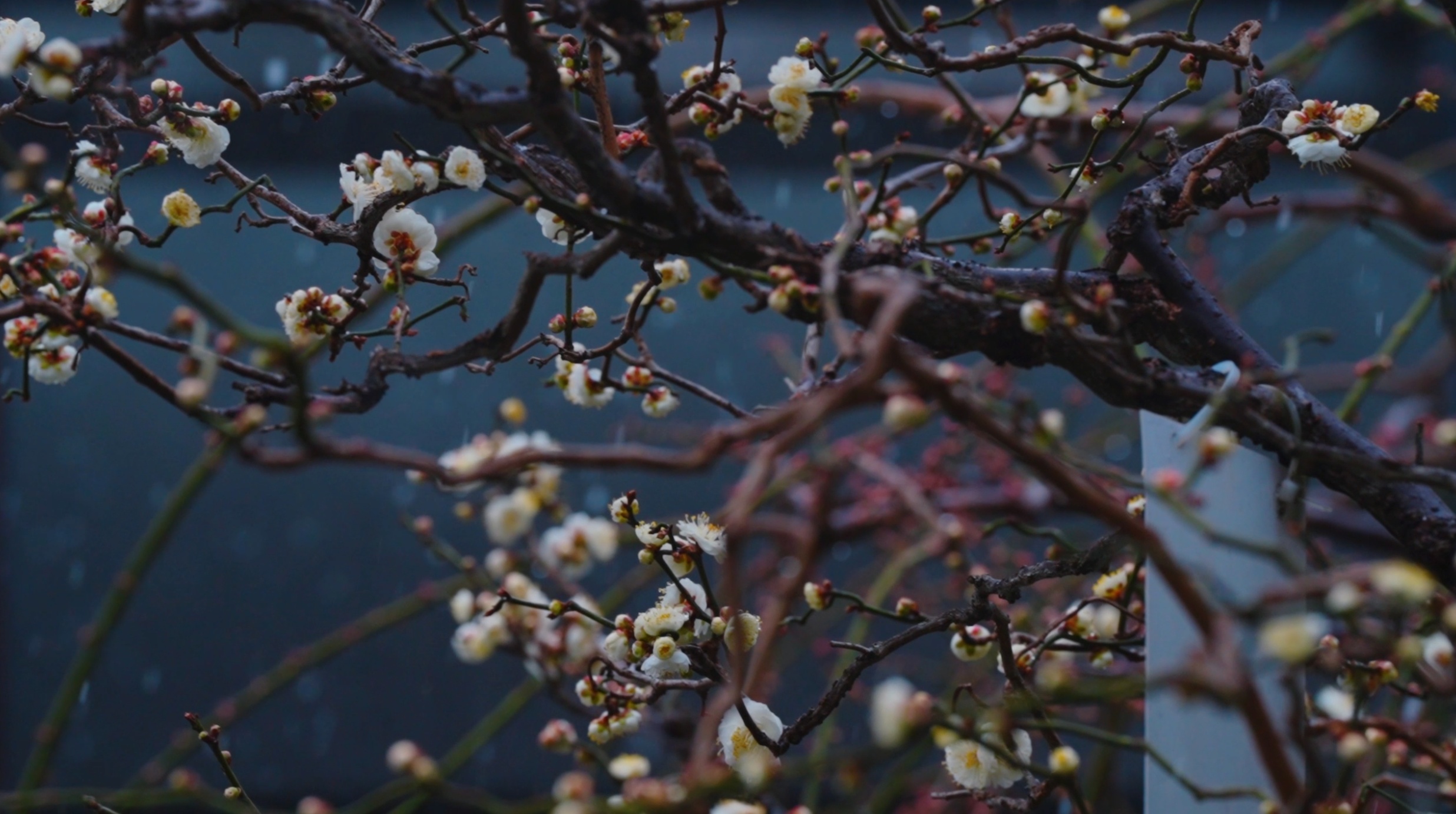上午10时许,公园已笼上一层薄雪。走近梅园细看,部分早花品种的枝头已跳出零星花朵,在大雪纷飞衬托下愈显清丽。其中,园内珍品“龙游梅”尤为引人注目。其树枝天然扭曲,形似游龙,枝头绽放的花朵宛若点点龙鳞,与飘雪相映成趣,展现出独特的风姿。据园方介绍,龙游梅是静安雕塑公园最早开花的品种之一,花期早而短,眼下正渐入佳境。