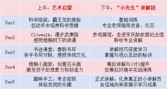 艺启讲·寒假成长全日营 寒假来临,您是否还在为 “孩子无人管、作业没人盯、 假期浪费时光”发愁? 别急! 这个能让孩子收获满满寒假托班重磅上线 将作业辅导、创意艺术启蒙、 语言能力提升融合 让孩子在安全陪伴中收获知识与成长 让家长安心工作无后顾之忧 HAPPY NEW YEAR 托班核心亮点 主题化设计 5天活动,艺术启蒙与讲解训练相辅相成,兼顾趣味性与实用性。 沉浸式体验 走出教室,走进武康路、宋庆龄故居,在真实场景中学习,记忆更深刻。 专业师资护航 艺术老师+语言导师+研学教练三方加持,既教技能又保安全。 成果可视化 结营收获春联作品、石头画、考古纪念品+“小先生”讲解团证书,成长看得见! HAPPY NEW YEAR 活动安排 HAPPY NEW YEAR 活动详情 招募对象 7—14岁 招募人数 20人/期 (满10人开营,不满人数另行通知) 活动时间 2月2日至2月6日(周一至周五) 9:00—16:30(可托管至17点) 活动价格 早鸟价:3280元 2480元 活动地点 闵融实训基地 (闵行区莘凌路204号) 报名方式 扫描二维码报名 扫描二维码咨询