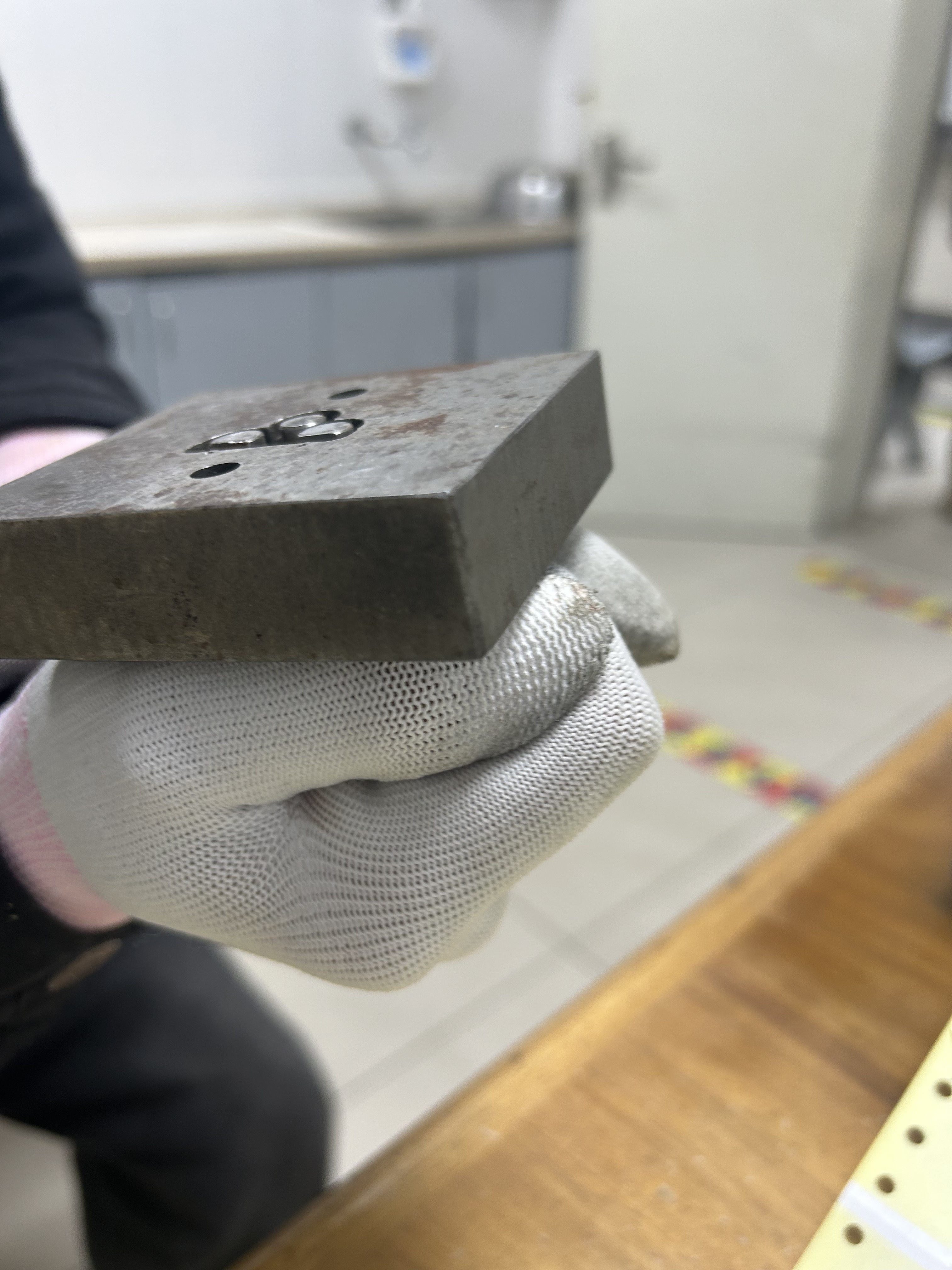 关键时刻,曹磊观察到钢钉与模具间的细微缝隙,果断采用“杠杆顶出”法:将一字螺丝刀插入缝隙,用榔头轻敲刀柄借力。过程中,螺丝刀把手虽意外断裂,但仍成功让钢钉露出模具表面,随后曹磊用老虎钳将三枚钢钉逐一拔出。