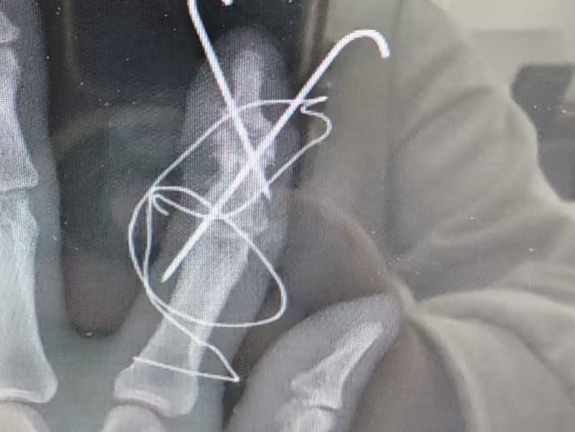 CT结果显示,三枚钢钉中的两枚击穿了患者食指中节指骨,一枚贯穿远节指骨,伴随粉碎性骨折与伸肌腱断裂。患者被直接送入手术室。手术团队先尝试徒手拔除模具未果,又因担心加重骨骼损伤不敢用力敲击,手术陷入短暂僵局。