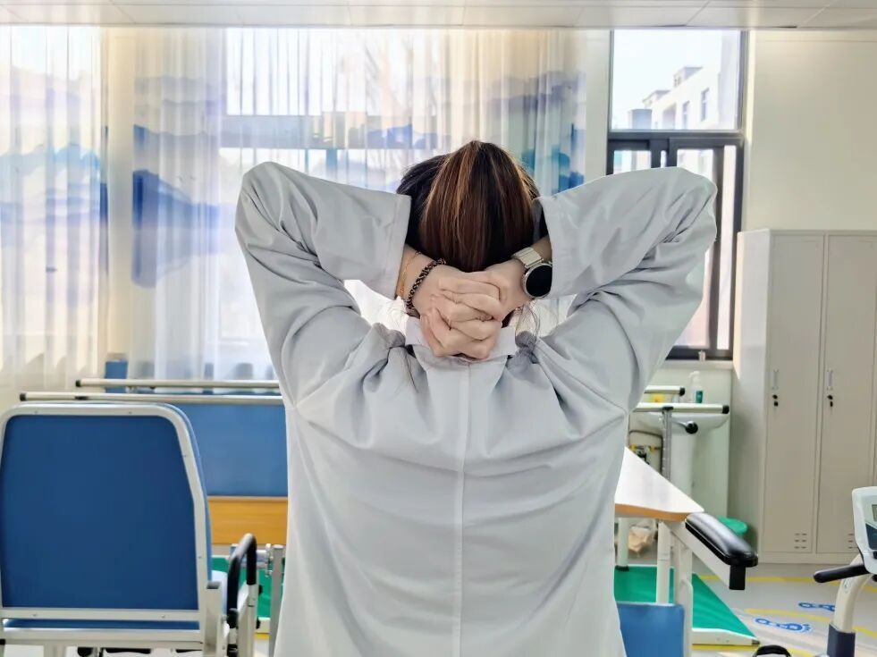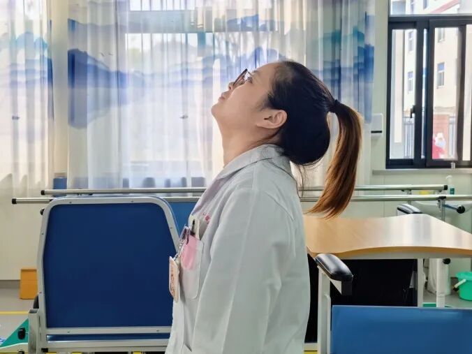 颈部放松:缓慢、轻柔地向各个方向活动颈部(前屈、后伸、侧屈、旋转),每个方向末端保持15~20秒。