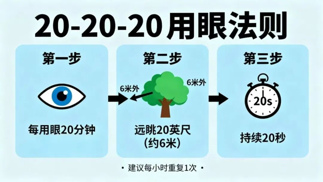 核心操作:严格执行“20—20—20”法则——每工作20分钟,抬头看20英尺(约6米)外物体20秒。每小时要起身活动5分钟。