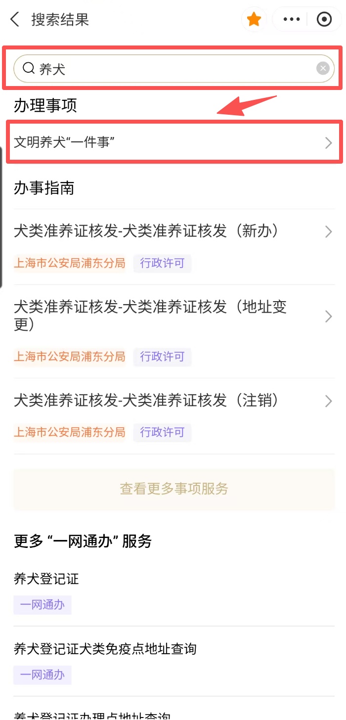 打开“随申办市民云”(APP/微信小程序/支付宝小程序),首页搜索关键词“养犬”,找到“文明养犬‘一件事’”服务。