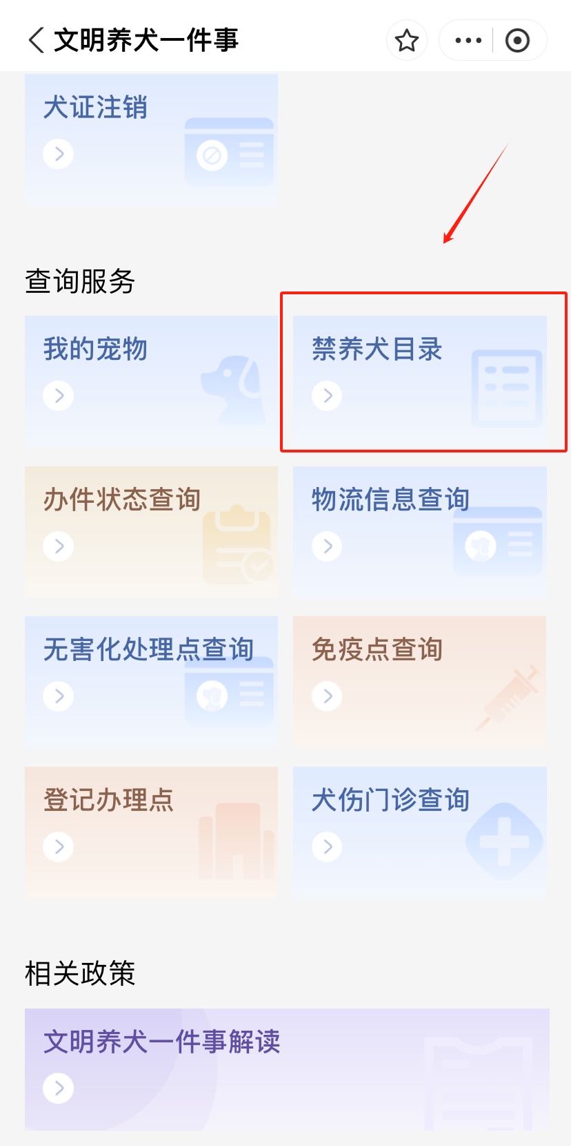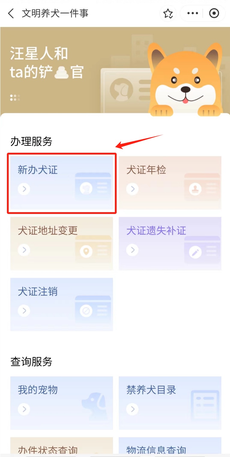 1、在“办理服务”版块中选择“新办犬证”事项。