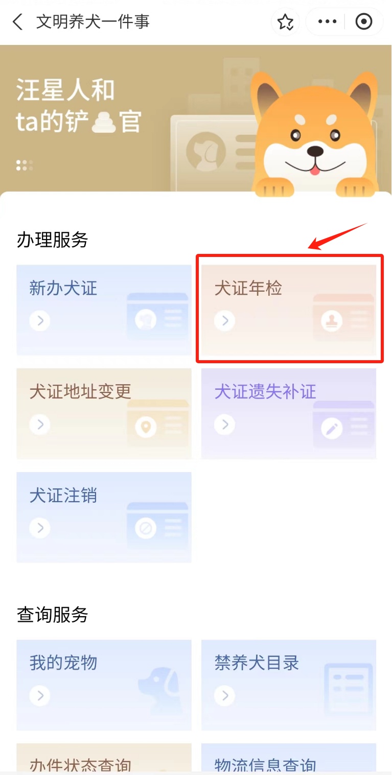 1、在“办理服务”版块中选择“犬证年检”事项。