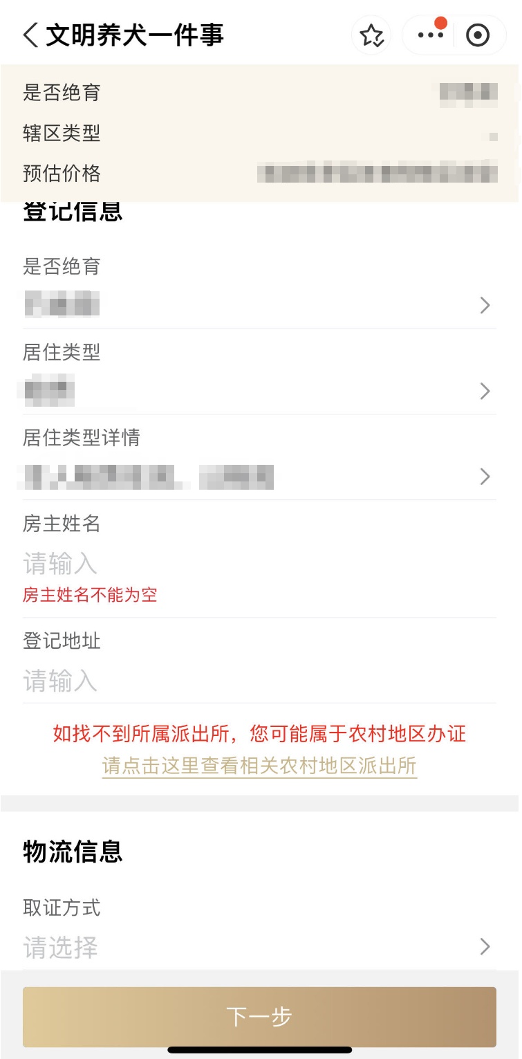 3、核实并完善犬只信息、犬主信息、物流信息,取证方式可选择快递到付或自取,线上签署“养犬承诺书”,上传个人身份证明(必传)、房产证明(必传)和犬只绝育手术证明(选填)相关材料并提交。