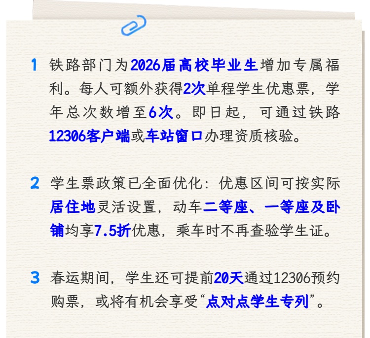 国铁集团明确对2026届高校毕业生额外增加2次单程学生优惠票。2026届普通高等学校毕业生可通过铁路12306客户端优惠资质专区申请办理毕业生优惠资质核验;未在“学信网”核验的部分高校和军事院校、宗教院校的2026届毕业生,可到车站窗口凭毕业生证明线下办理资质采集核验。完成核验后,本学年可享受的单程学生优惠票购票次数增至6次。