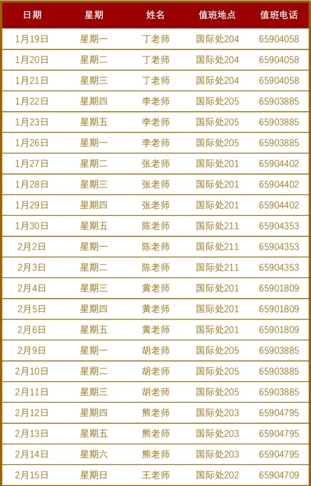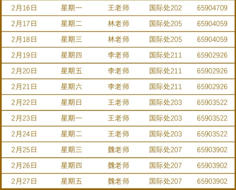 如需办理其他业务,请参考下列值班安排表,详询值班老师: