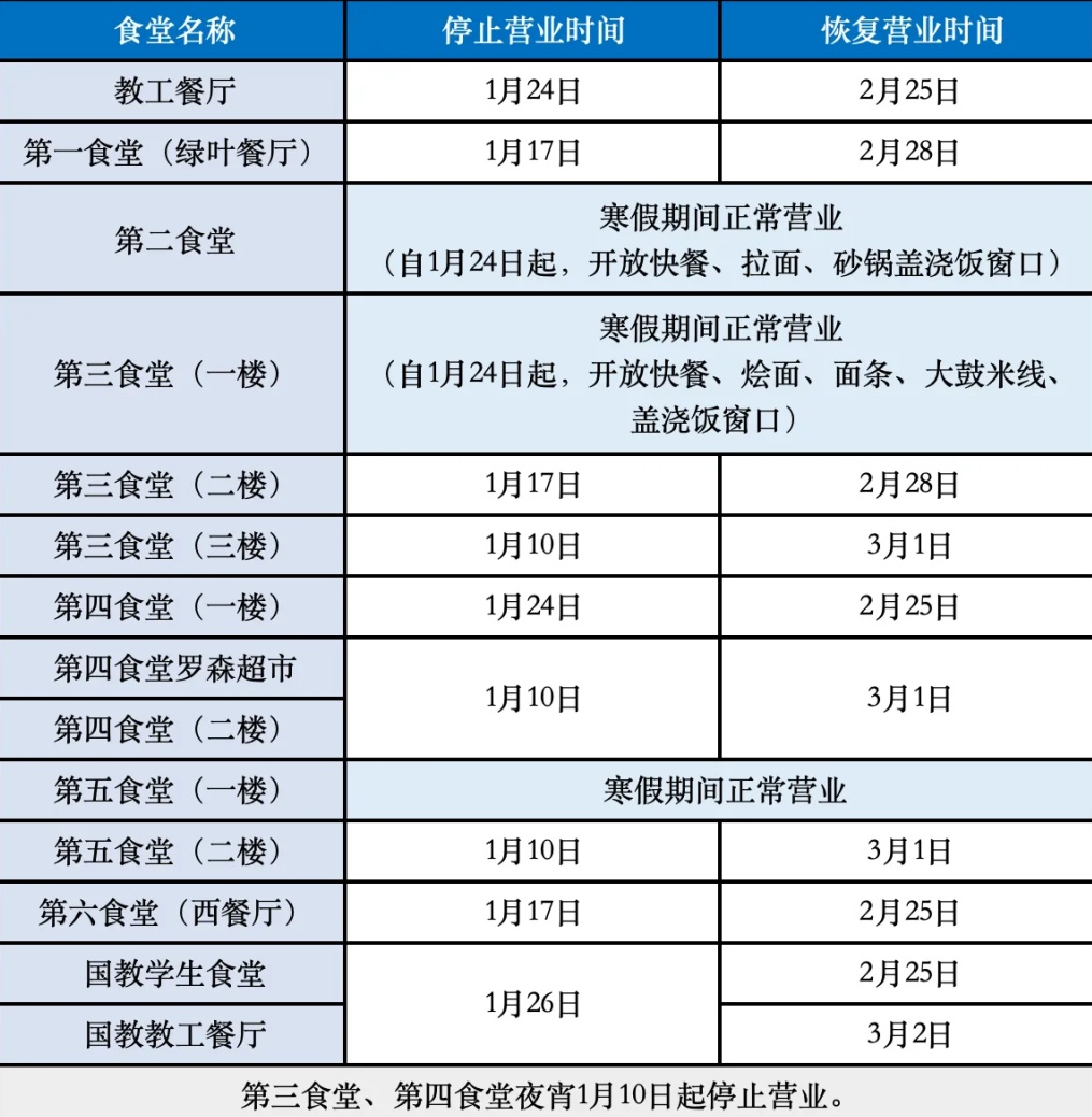 1)女生公寓园区公共浴室:2月5日至2月22日开放时间调整为17:00-23:00,2月23日起正常开放;