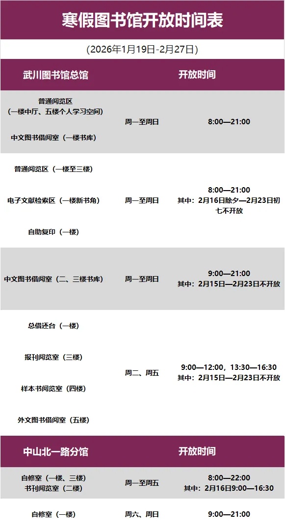 为服务校内外师生读者,上海财经大学图书馆365天保持开放,假期期间不同区域开放时间如下图: