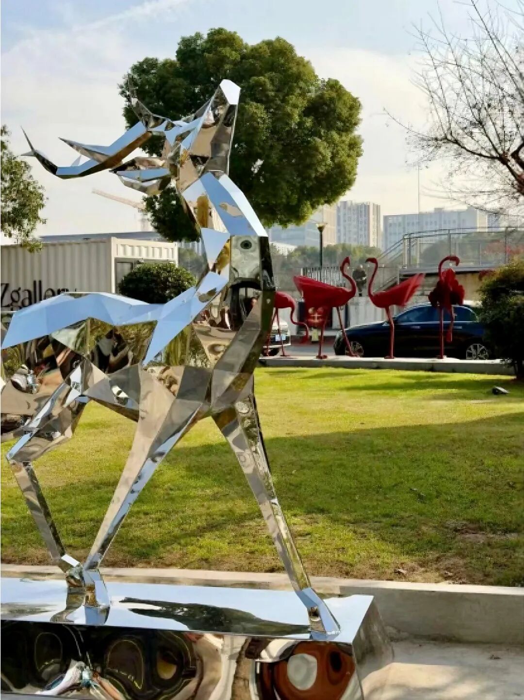 雕塑选用不锈钢材质——这一代表工业文明的媒介,来塑造象征自然与灵性的鹿,在视觉上形成强烈反差,也传递出一种深刻的人文理念:即使在钢筋水泥的城市中,自然的诗意从未缺席。